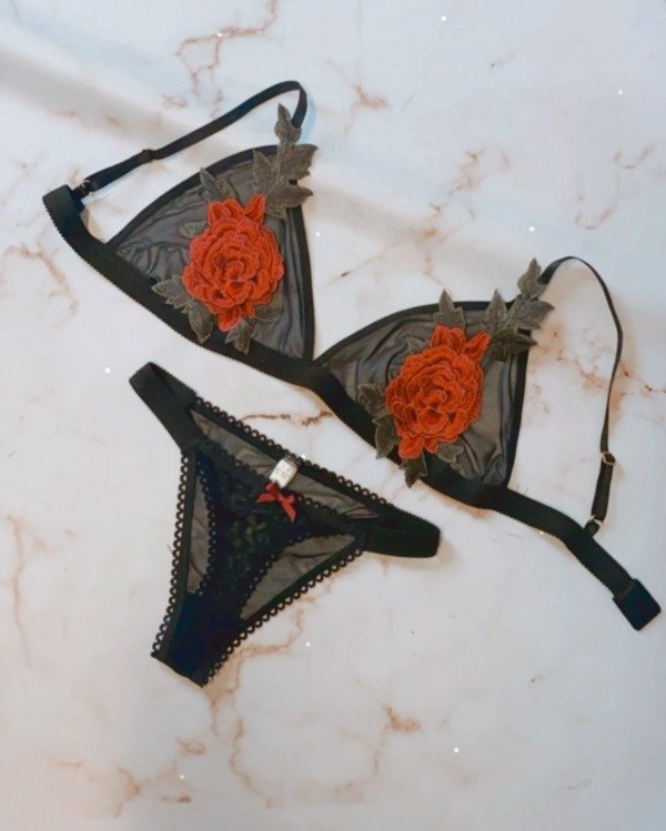 Corpiño de tull con apliques de rosas en cada taza y elastico ancho con relieves en bajo busto.