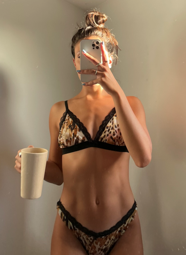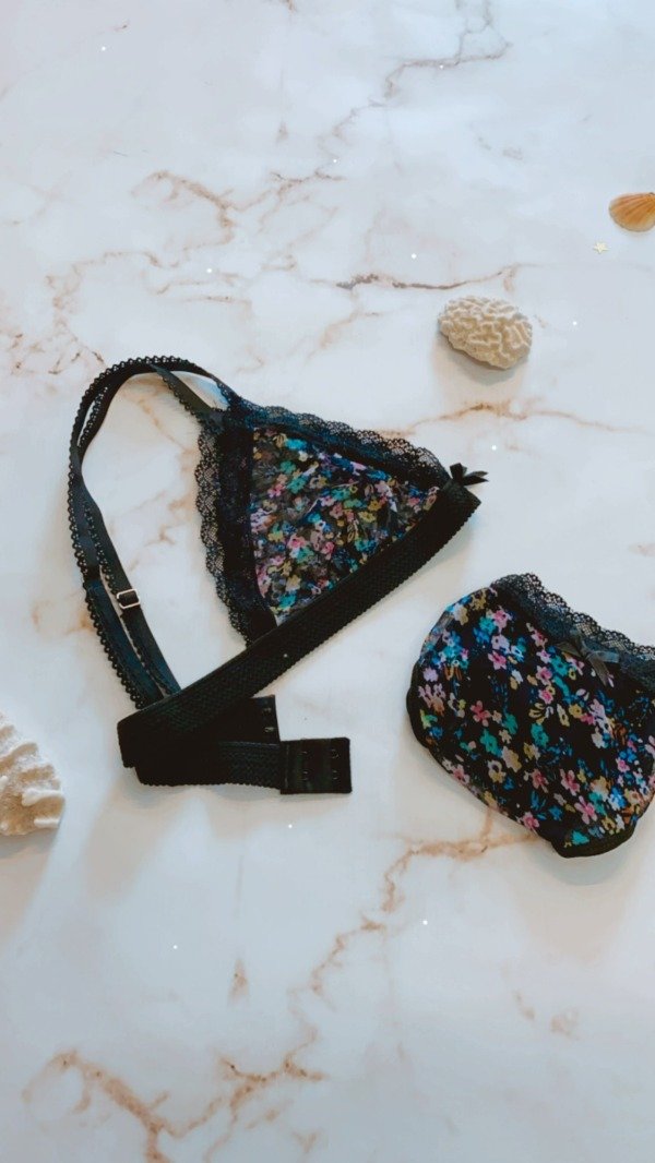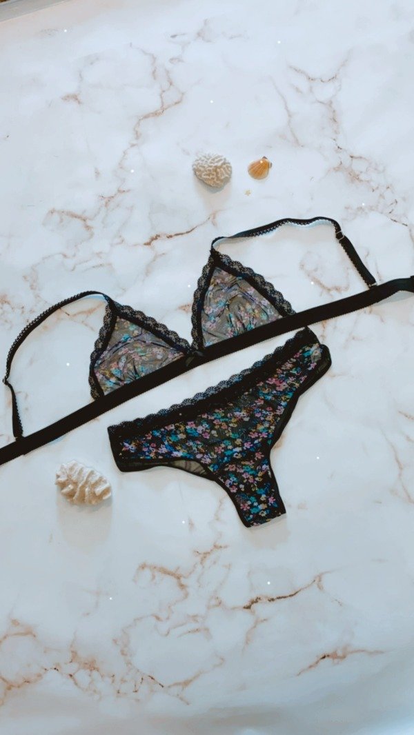 Corpiño triangulo de microtull estampado floreado, con puntilla en el contorno de busto.