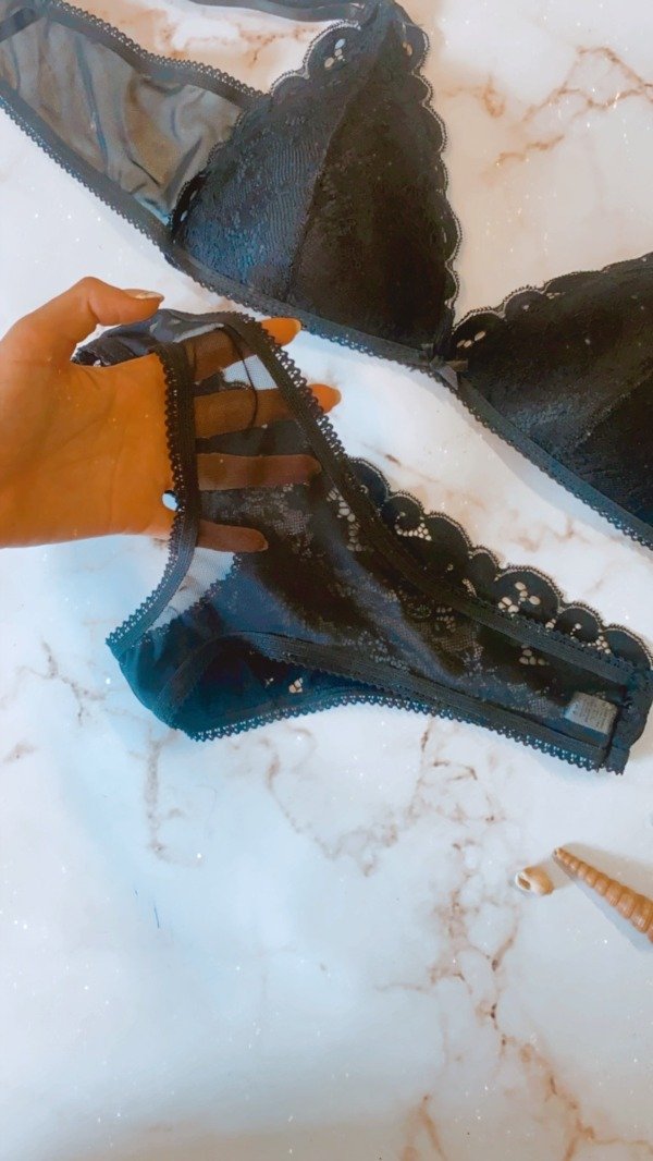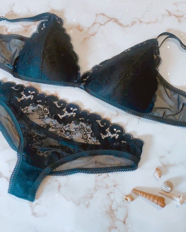 Corpiño de puntilla armado con relleno, breteles regulables y coletas de tull mas broche prolongador. Bombacha less con frente de puntilla y espalda de tull. Todos los avios metalicos son de Zamak , hipoalergenicos y antioxidantes.