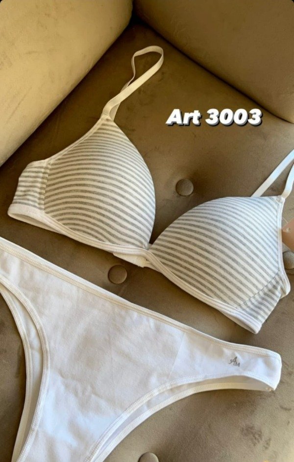 Conjunto de algodón. Corpiño rayado triangulito taza soft y vedetina lisa.