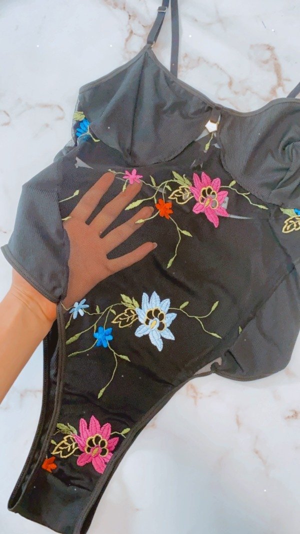 Body de micromorley con delantero en tull bordado. Breteles regulables y espalda con tecnica bondage con cinta de raso.