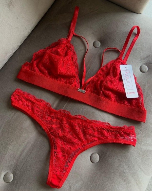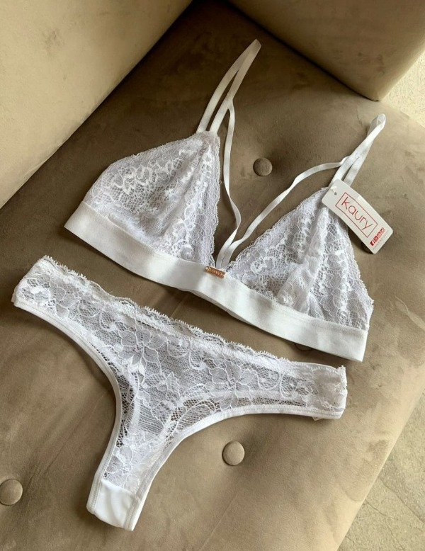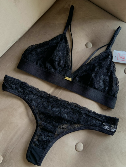 Conjunto de puntilla y tul. Corpiño triangulito con detalle de breteles en escote y cola less.