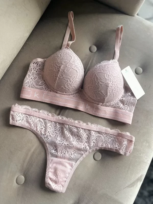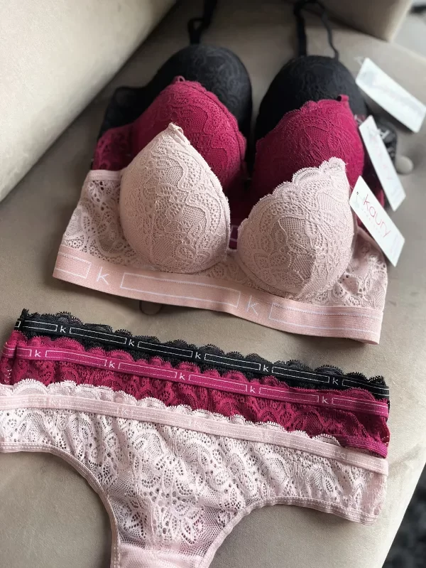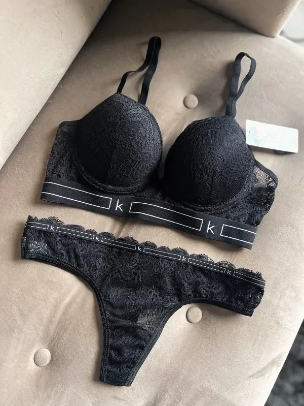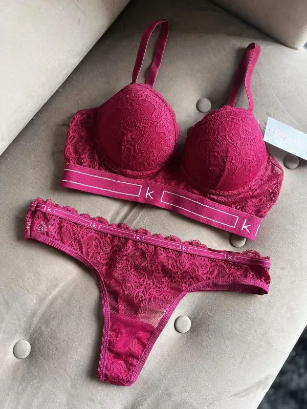 Conjunto de puntilla con elástico personalizado. Corpiño taza soft con push up y cola less.